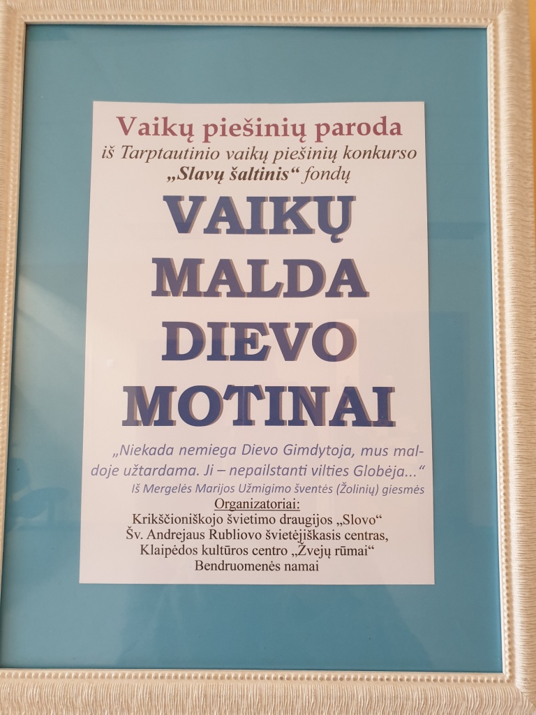 22 октября 2019 г. в Общинном доме Клайпедского Центра культуры «Дворец рыбаков» открылась международная выставка юных художников «Детская молитва Божией Матери», организованная Просветительским центром им. св. Андрея Рублёва, Обществом христианского просвещения «Слово». Организатор выставки, искусствовед Маргарита Артамонова, представила работы детей 6-18 лет из Литвы, Белоруссии, России, Польши, Болгарии, Чехии, Румынии, Украины и даже Китая. Основные техники исполнения рисунков: гуашь, акварель, мозаика и др.